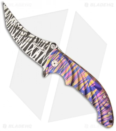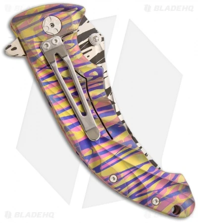 This Tighe Stick folder from Brian Tighe is an exquisite custom knife that really stands out! It features a fluted titanium handle with a multi-color finish and filed inside edge. The hardware and pocket clip are satin finished. The stainless steel blade has a stripe etched finish and upswept tip. The blade has ambidextrous thumb studs and an integrated flipper/guard.