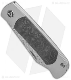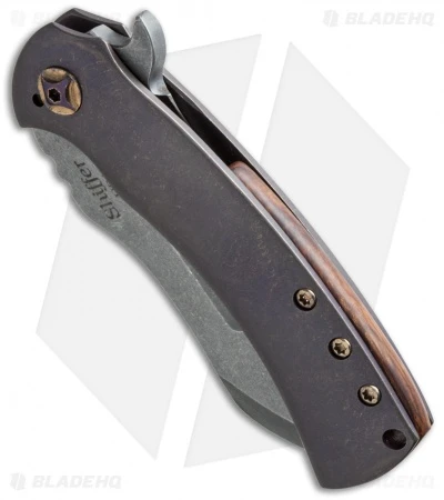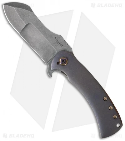 The Panda flipper from Doc Shiffer is a stylish design with a distinct bullnose, harpoon style blade. This knife has a marbled blue/purple anodized finished handle with a desert ironwood back spacer. Its compound ground blade has a light acid stonewashed finish.