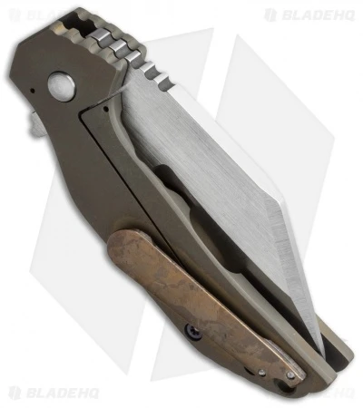 The Mini-FOK flipper is based on the full-size model and exhibits the same robust build. This model has a clip point Carpenter XHP steel blade with a course brushed satin finish. The titanium frame lock handle is dark gold anodized and sports heat colored hardware and a UNOB metorite-pattern gold finished titanium pocket clip.