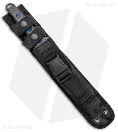 - Carbon fiber handle scales over a jimped full tang and blue titanium hardware.