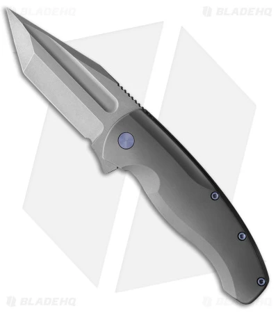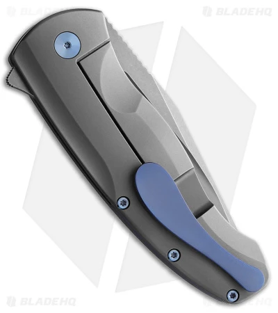 - Gray titanium handle with blue hardware.