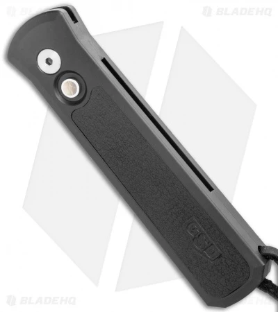This Godson is a collaboration between Pro-Tech and Greg Stevens Design. It has a black anodized aluminum handle with a mirror polished CPM-154 blade and black hardware. The handle has a black, vintage, Swiss leather inlay and lanyard. The piece is completed with a small, black, deep-carry pocket clip.