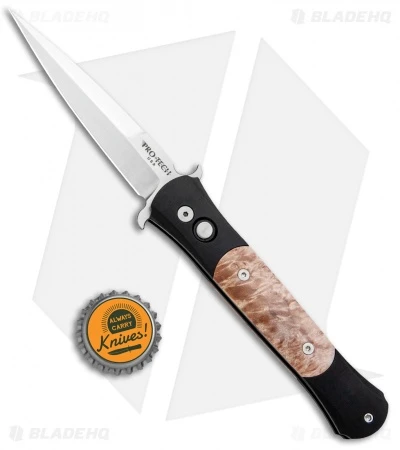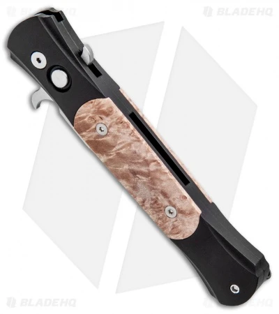 This Don knife features a satin finished blade and a black anodized aluminum handle with polished Maple burl wood inlays. The firing button and hardware are satin finished.