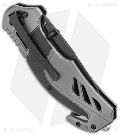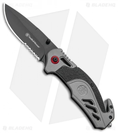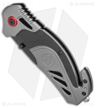 The gray and red Smith and Wesson S.A. is a no-frills tactical rescue knife with aluminum handle scales, a glass breaker, seat belt cutter, a spring assisted partially serrated blade, and a tip down deep carry pocket clip. Add this knife to your kit today!