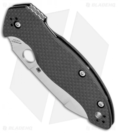 The Canis from Spyderco is a spectacle of a knife designed for everyday carry. The blade is made of CPM-S30V, and features a truly unique blade profile and grind. It has a Wharncliffe shape, a flat grind, and a ground out section which reduces weight, but full spine thickness near the tip to reinforce it. The handle is made of a carbon fiber/G-10 laminate with a gentle texture to hold it nicely in the hand.