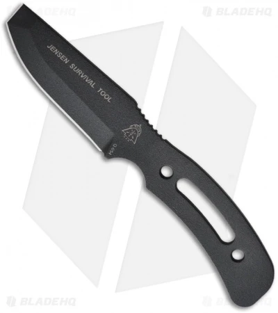 The TOPS Knives Jensen Survival Tool is intended to take on the heavy chiseling and prying uses that lighter knives can’t handle, but without becoming so overly large and cumbersome that it is left behind when most needed. The handle and chisel with one side rounded and one side square is specially designed to make primitive tools such as bows, arrows, bowels, etc from natural materials. In use it is used similar to a chisel or gouge to carve out bowels, spoons and other useful items. It can be driven into a tree with a baton to cut it down or split it as shown in Mors Kochanski’s Bushcraft without fear of breaking the handle as some hidden tang knives do. The ‘SHANGO’ style firesteel and arrow shaft scraper is a TOPS exclusive. The blunt tip is compliant with safety regulations for most youth wilderness trekking programs.